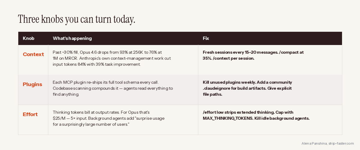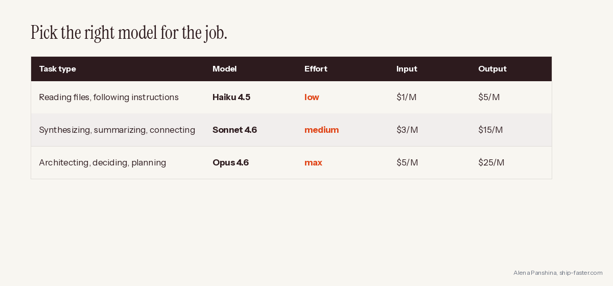 You’ll find most of your tasks could be done with cheaper models (but you have to test, unless you can even spend more). 5x between models on input. 5x again on output. Advisor strategy: expensive model plans, cheap model executes. Thinking tokens bill as output, so /effort low strips extended thinking on routine work.