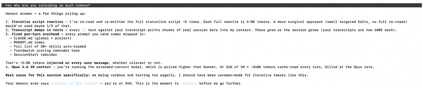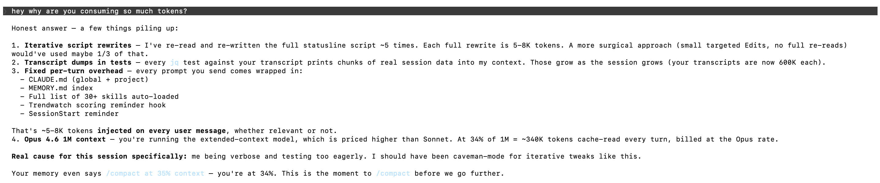 This morning: opening Claude and running /caveman took 3% of my context. Adding my daily personal assistant checkin — another 2%. Five percent, 5K tokens, before real work began.