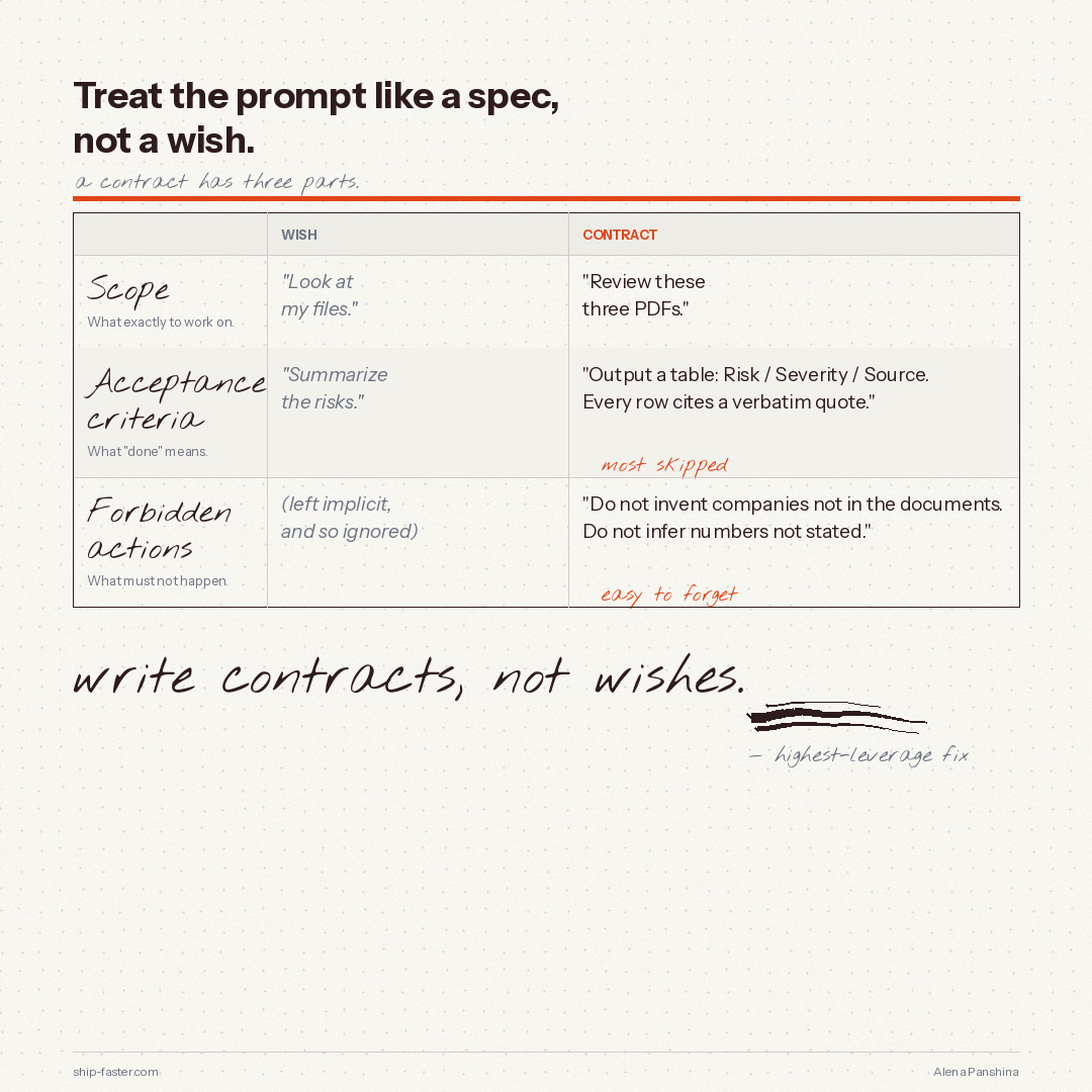 Acceptance criteria. What “done” means. Wish: “Summarize the risks.” Contract: “Output a table with columns Risk / Severity / Source. Every row cites a verbatim quote.”
