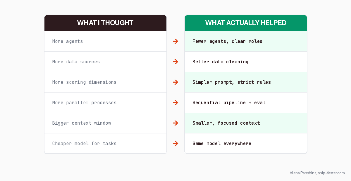 Another one: I tried a cheaper model for scoring to save costs. It produced broken JSON that crashed everything downstream. Switched back to the expensive model for all agents, zero exceptions. Sometimes the “optimization” is the problem.