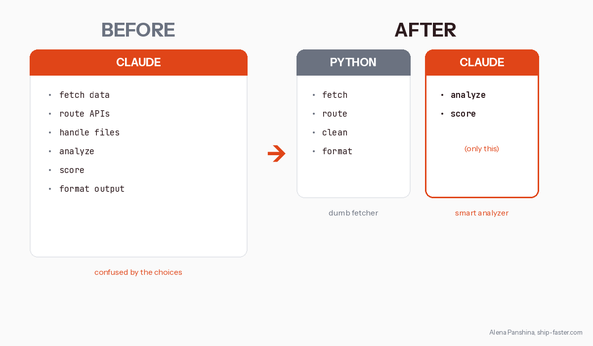 Version 7 ran for 3 hours and never finished because the agent was doing everything — fetching data, routing APIs, handling files, analyzing, scoring, formatting output. I kept throwing more at Claude because that’s what felt natural — more tools, more responsibility, more context — and three hours later I had nothing.