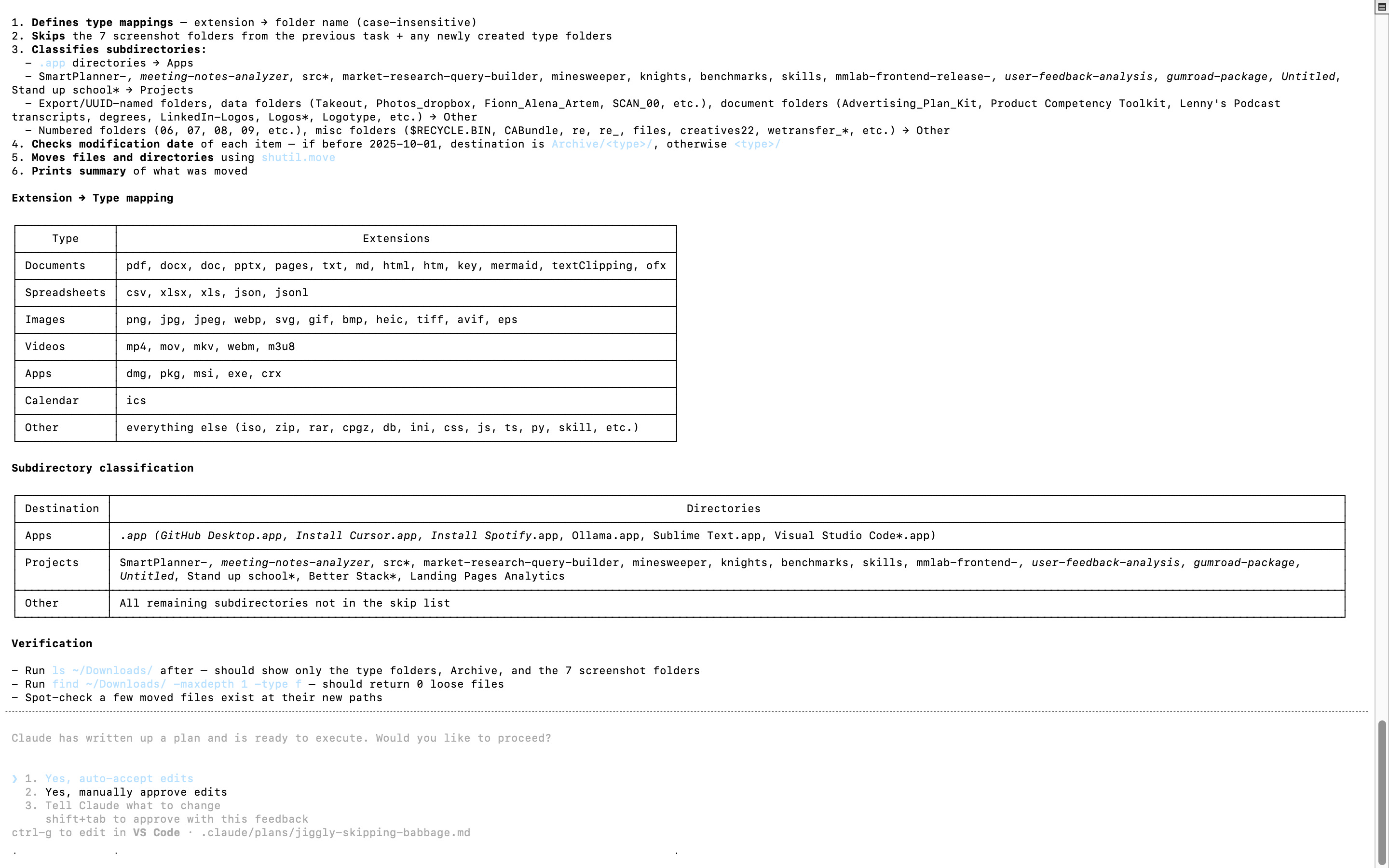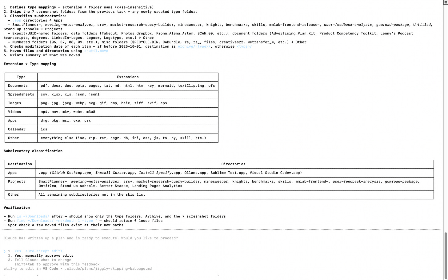 For anything older than 6 months create a folder "Archive".It lays out the proposal — here’s what I’d move, here’s the directory structure. You review it, adjust if something’s off, then switch back to normal mode and approve.