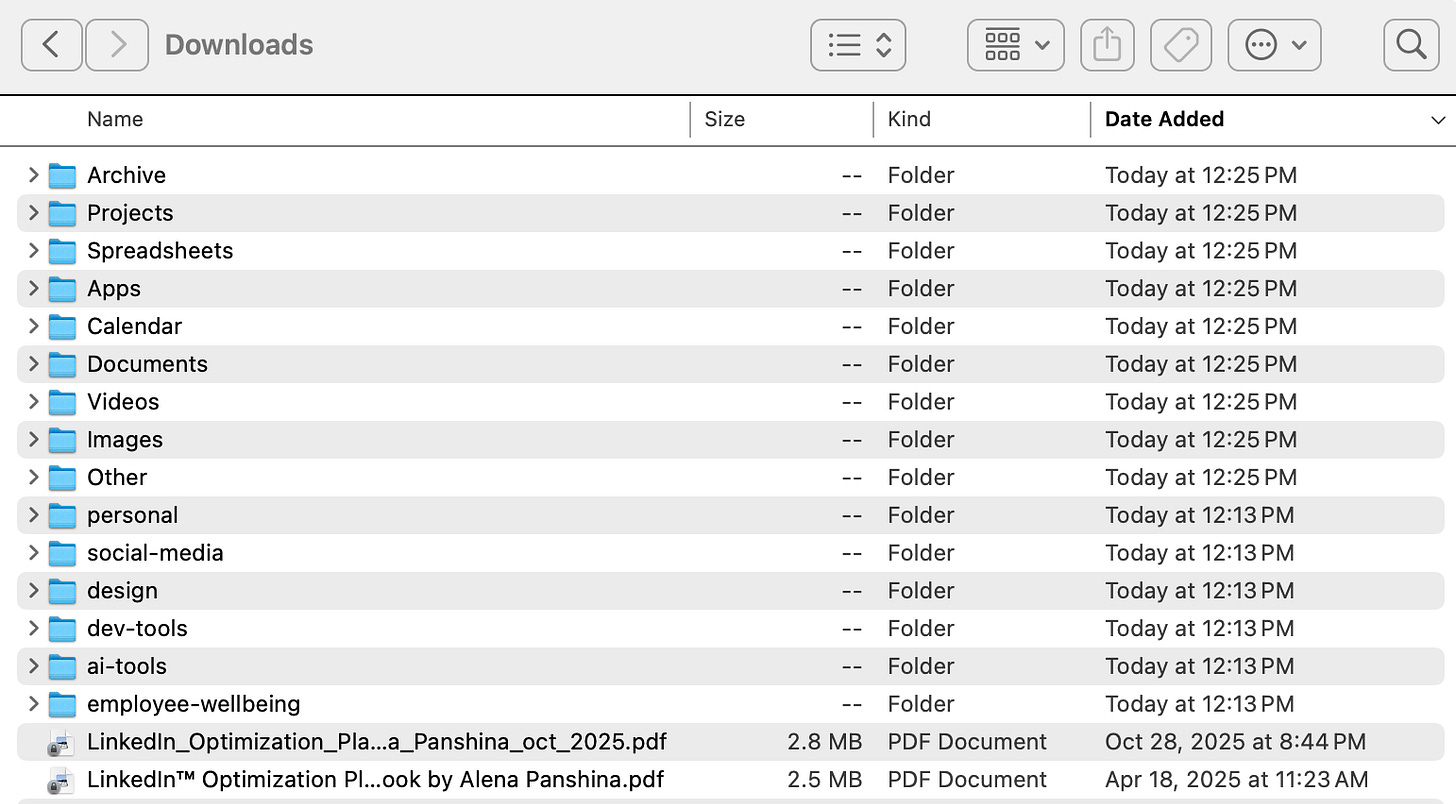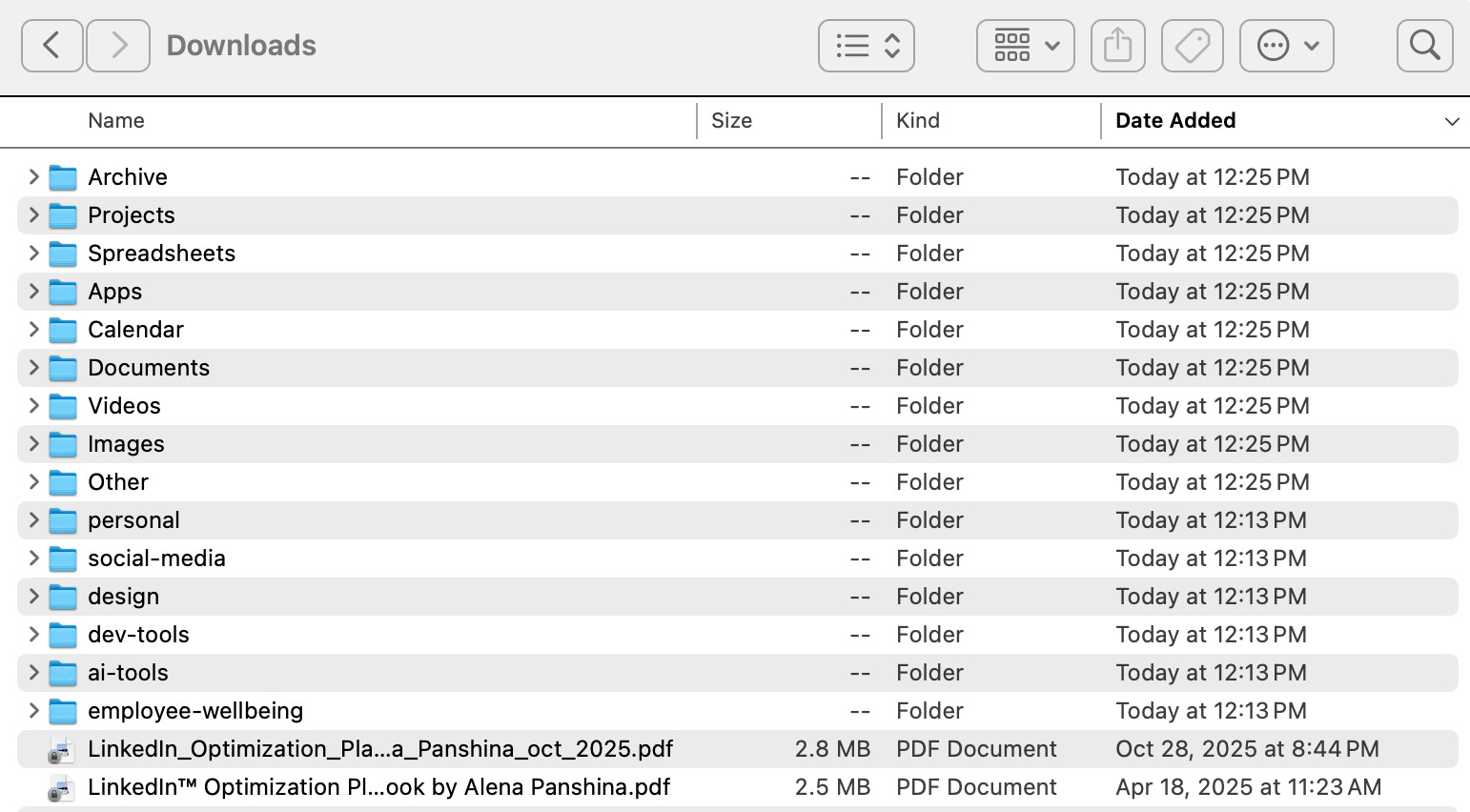 The Downloads folder has ~2,500 files and ~113 subdirectories accumulated over years — that's what Claude told me.