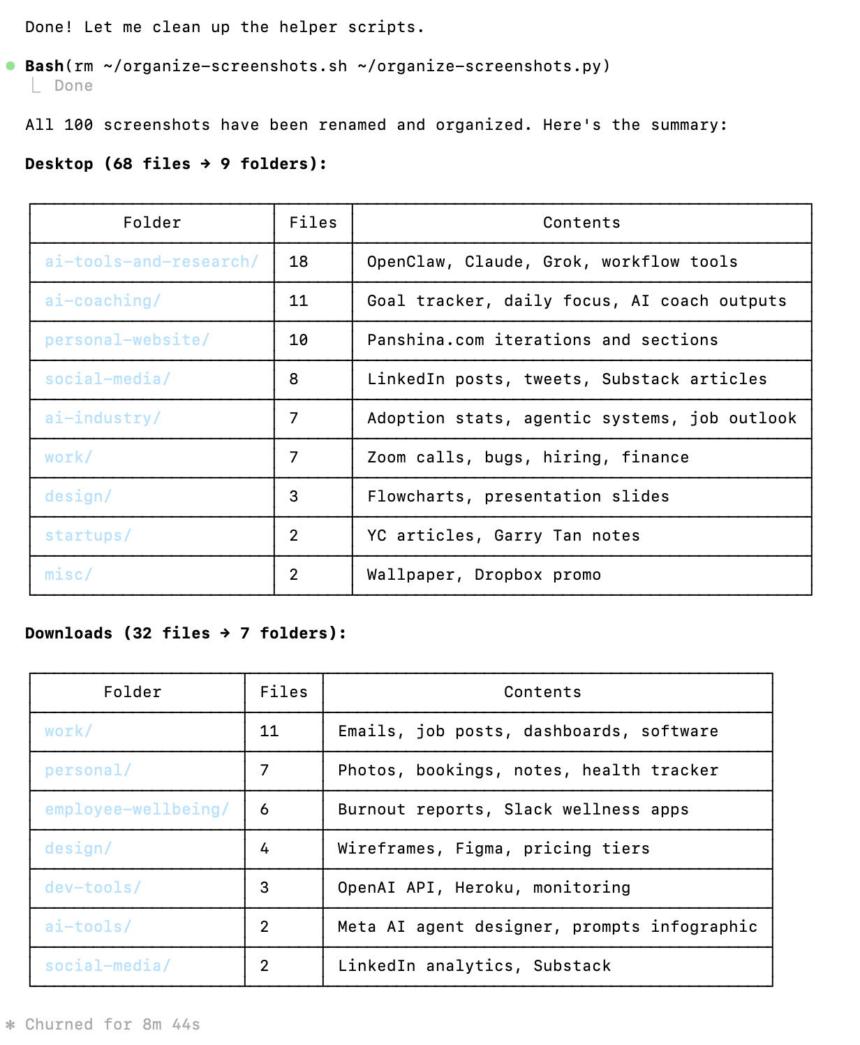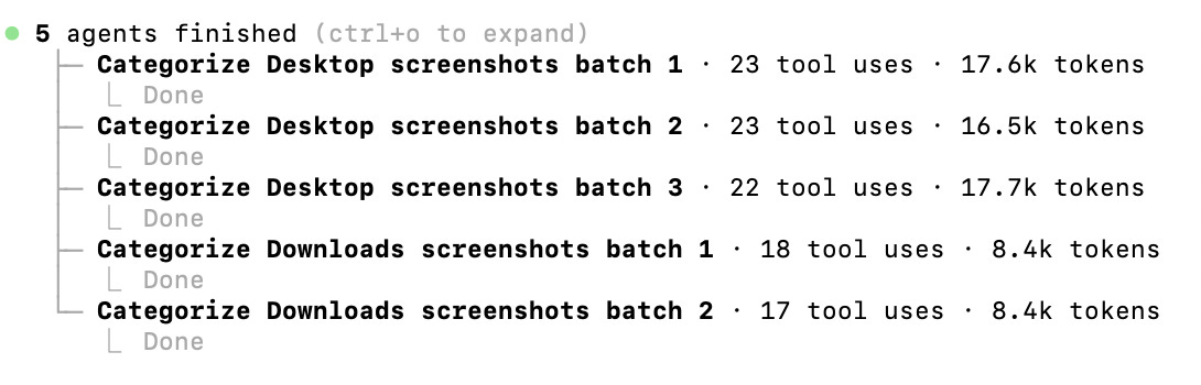 Group them into subfolders by topic.It opens each image, figures out the content, renames it, and sorts it into subfolders. A hundred screenshots takes about 8 minutes and 10 parallel agents — so you point it at the directory and go make coffee.